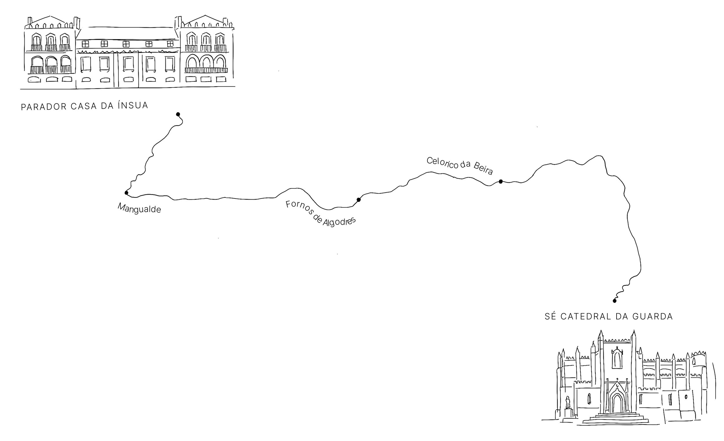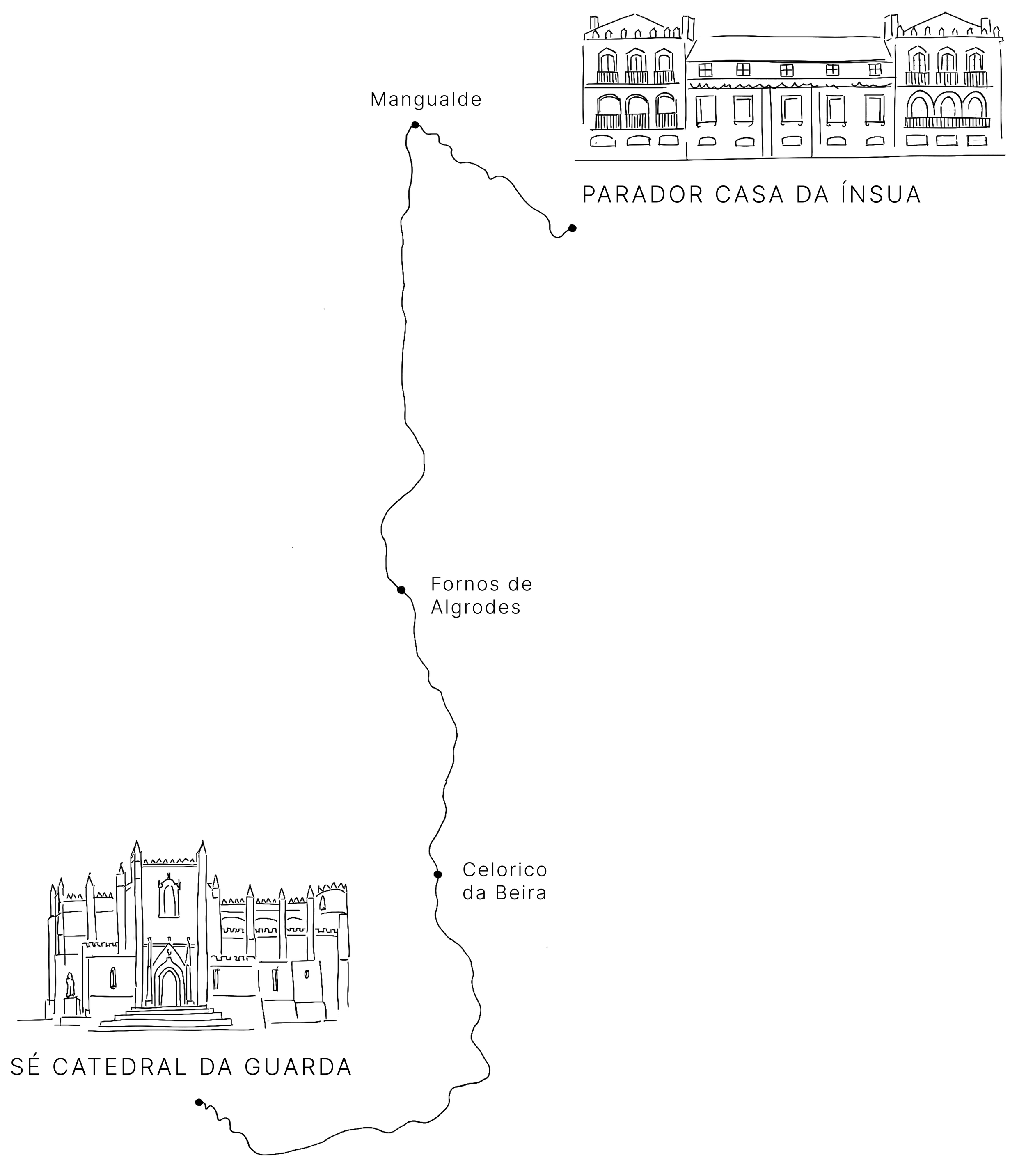 Com saída na Sé da Guarda, o percurso segue pela A25 / N16 passando por Celorico, Fornos, Mangualde até Penalva do Castelo (Ínsua).